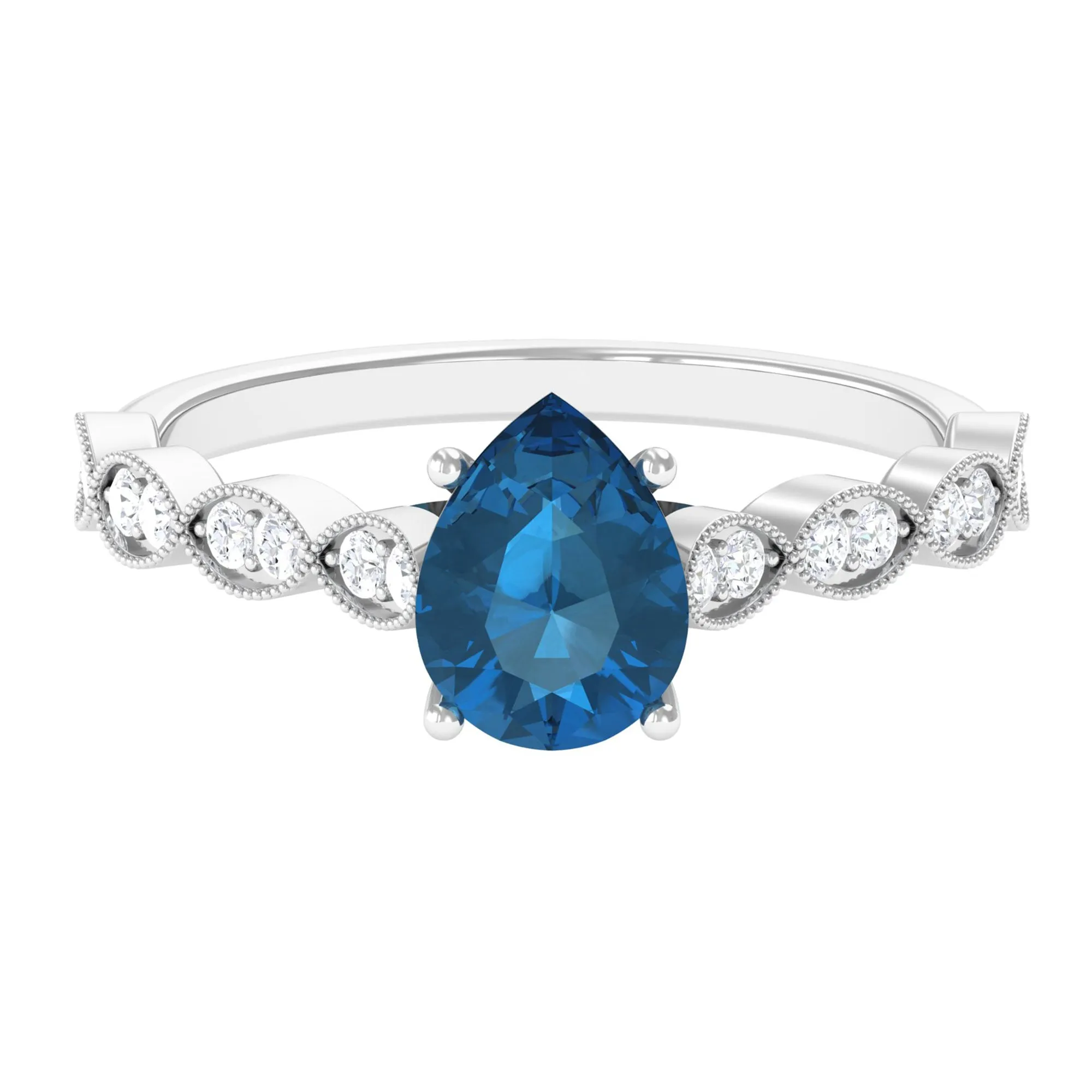 Bespeak style with this Pear Cut London Blue Topaz Solitaire and Diamond Engagement Ring. The teardrop-shaped London Blue Topaz gem, totaling 1.25 carats, takes center stage, accented by a brilliant diamond, creating a captivating and elegant design. This ring is a perfect combination of rich blue hues and timeless sophistication, making it an ideal choice for a statement piece or a special occasion.