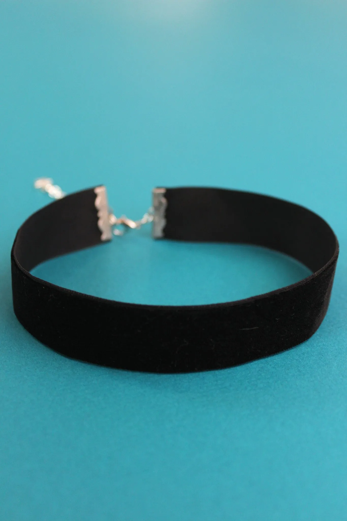 1" black velvet textured lightweight choker necklace with trigger clasp closure backing and 2" extender chain with delicate star detailing on the end. Choker length is approx. 12" for a snug fit.