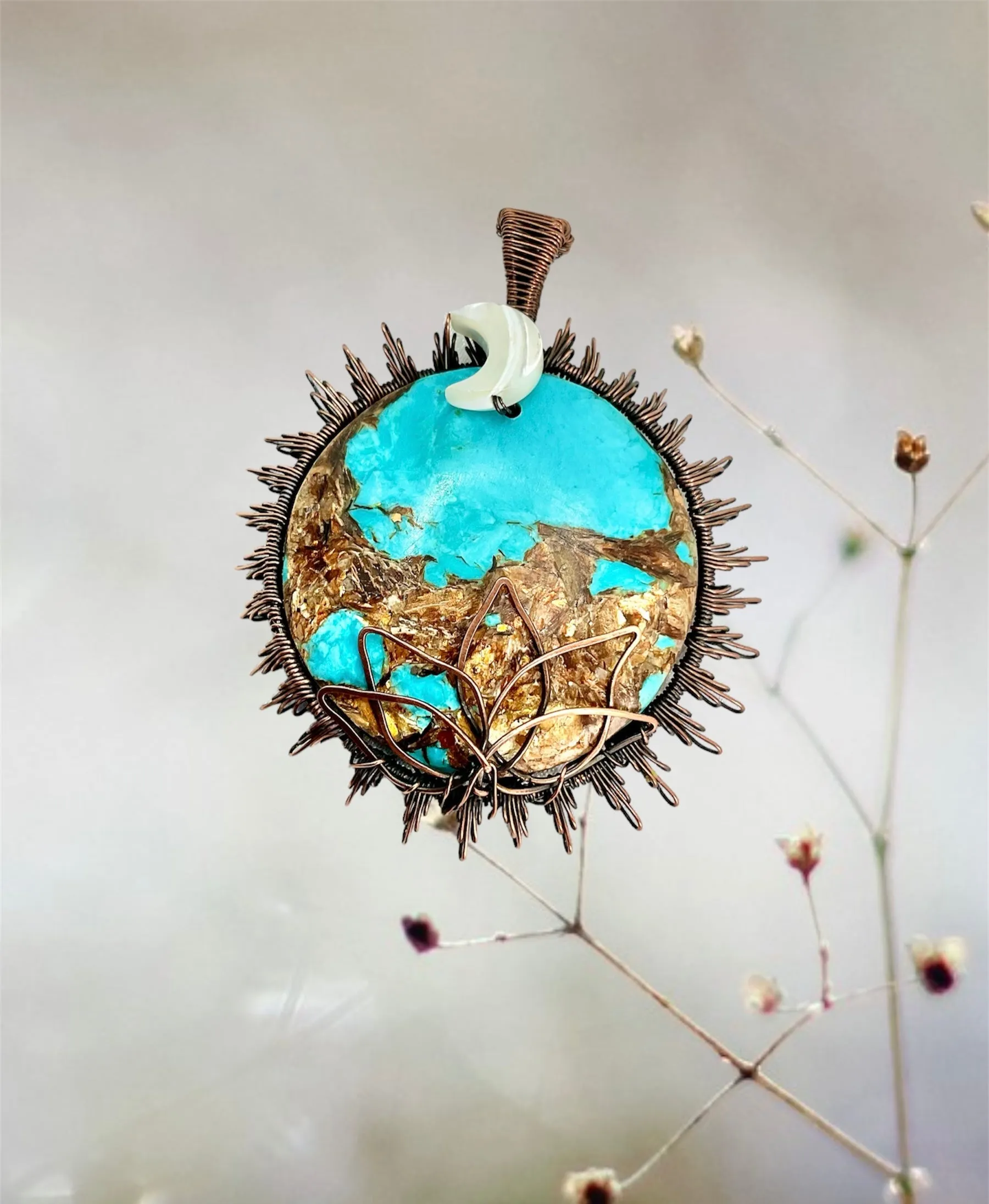 Copper Turquoise Sun, Moon & Lotus Pendant