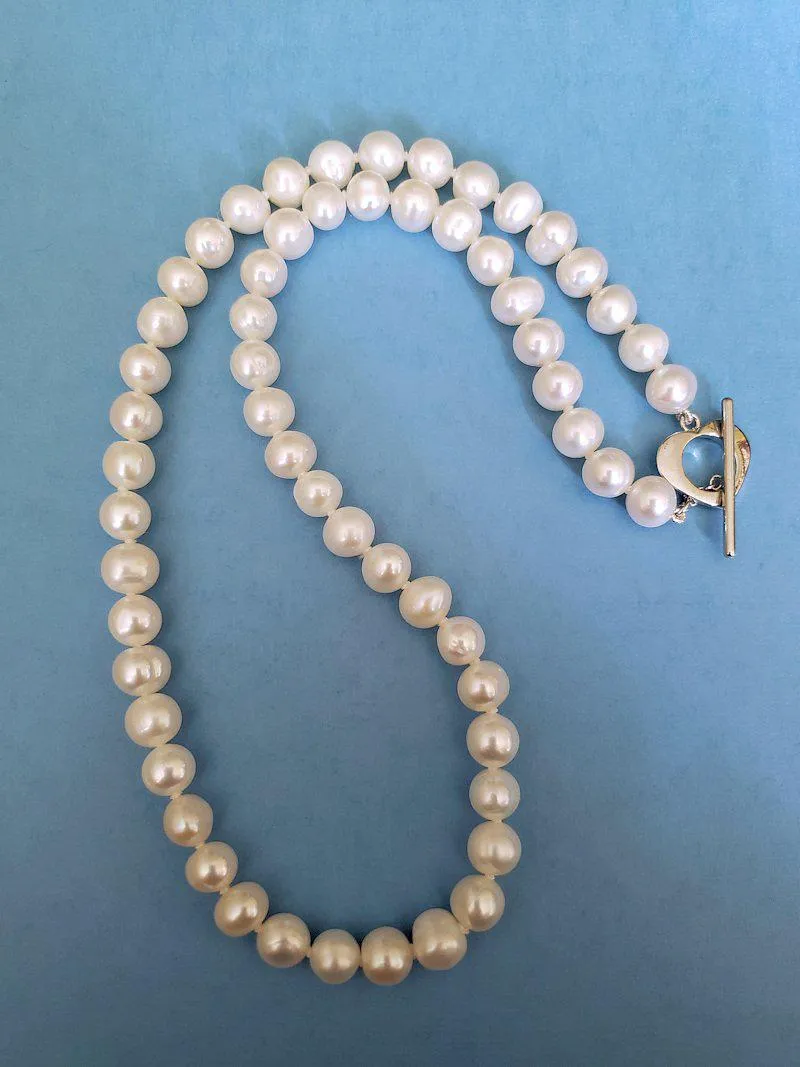 This pretty Pearl Necklace comes in your choice of all Ivory, or a mix of Ivory, Peach, and Champagne Fresh Water Pearls. This style has been one of our best sellersfor years, as it is very elegant and flattering. The pearls are Baroque Circles and of excellent quality. A heart-shaped, Rhodium-plated toggle clasp completes this piece.