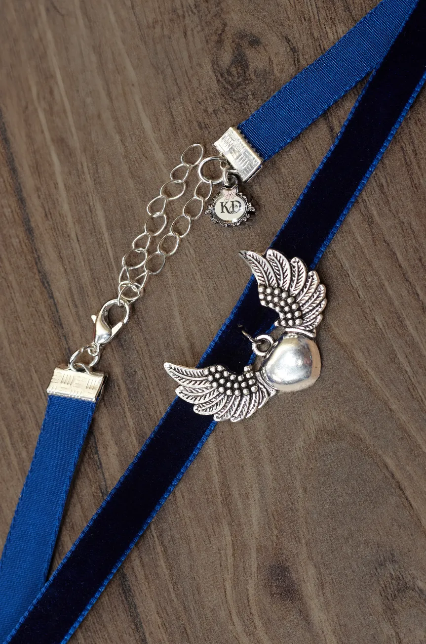 Crafted from luxurious blue velvet and featuring an intricate silvertone chain, this gorgeous choker is adorned with a silvertone heart-with-wings pendant at the front.