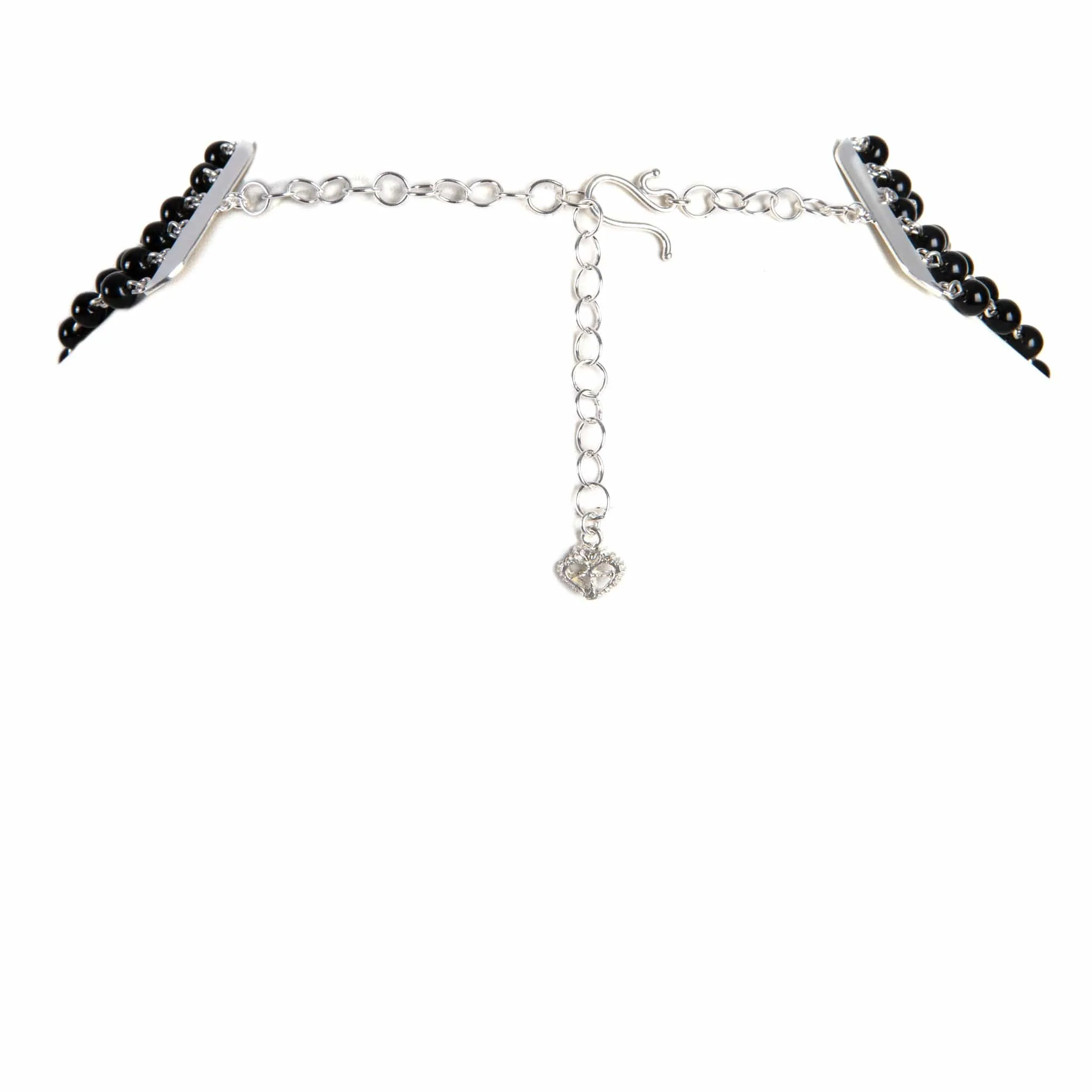 This collaristheultimate showcase for our iconic logo. Splashed with Austrian crystals, our heart logo sits as the centerpiece to multiple strands of perfectly fitted pearls. One of the most elegant pieces in our collection.