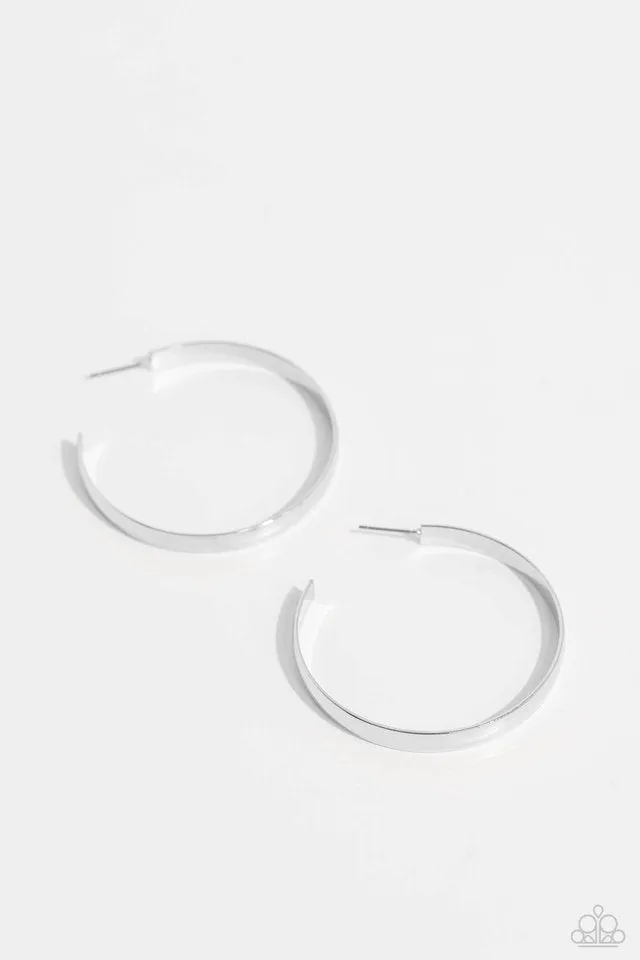 Embrace timeless elegance with these stunning silver hoop earrings, designed to catch the light with their radiant, high-sheen finish. The thick, sleek curve gracefully hugs the ear, ensuring a flawless and sophisticated style for any occasion. Each earring is secured with a standard post fitting, and they boast a generous diameter of approximately 1 3/4 inches.