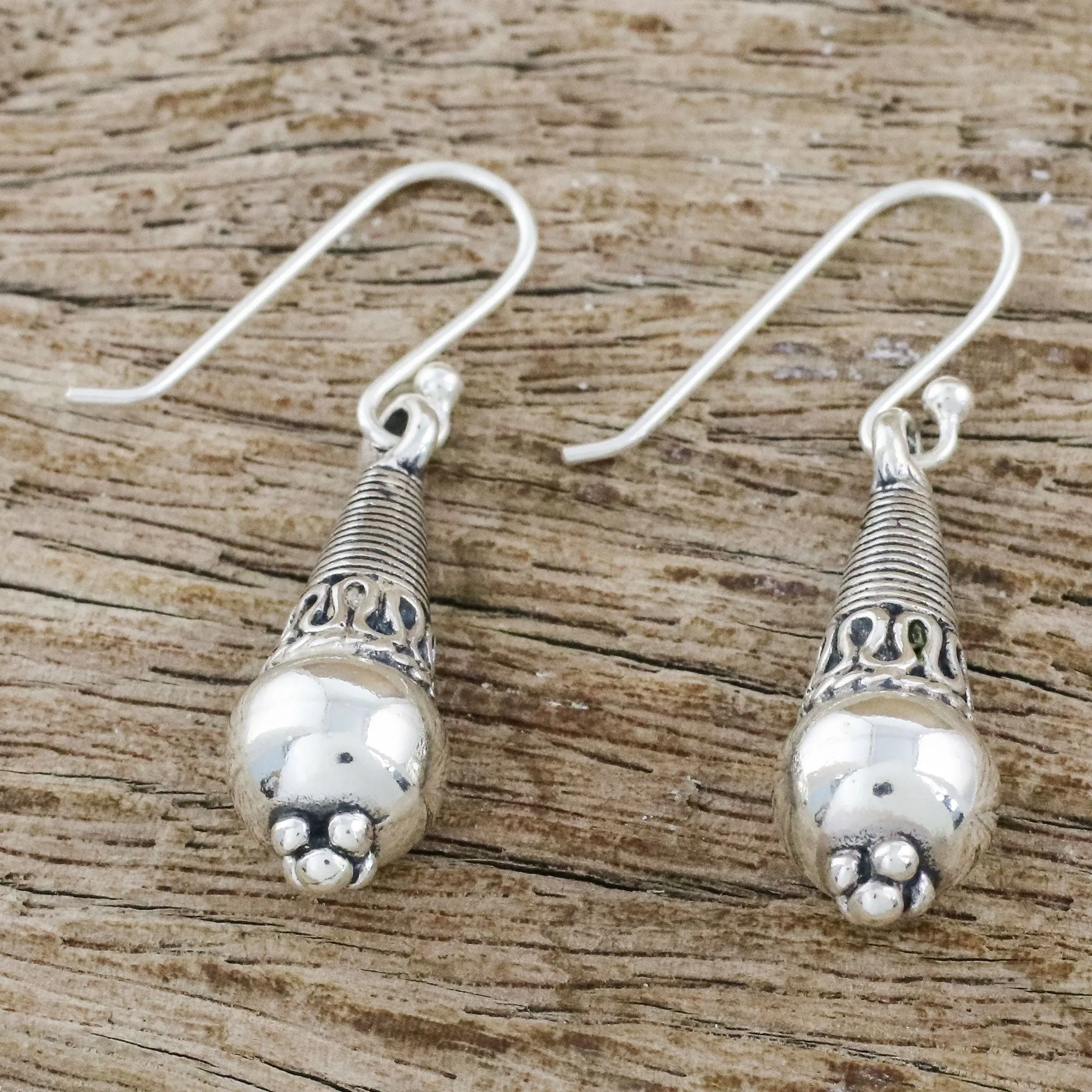 Thailand's Wadarat Supasirisuk presents these stunning dangle earrings that give a modern twist on traditional Thai motifs. Sterling silver is patterned with intricate swirls and lines that sit above a glossy orb topped with dainty balls of silver. The contrast between the oxidized details at the top and the smooth, sleek design at the bottom, give these earrings a contemporary appeal.