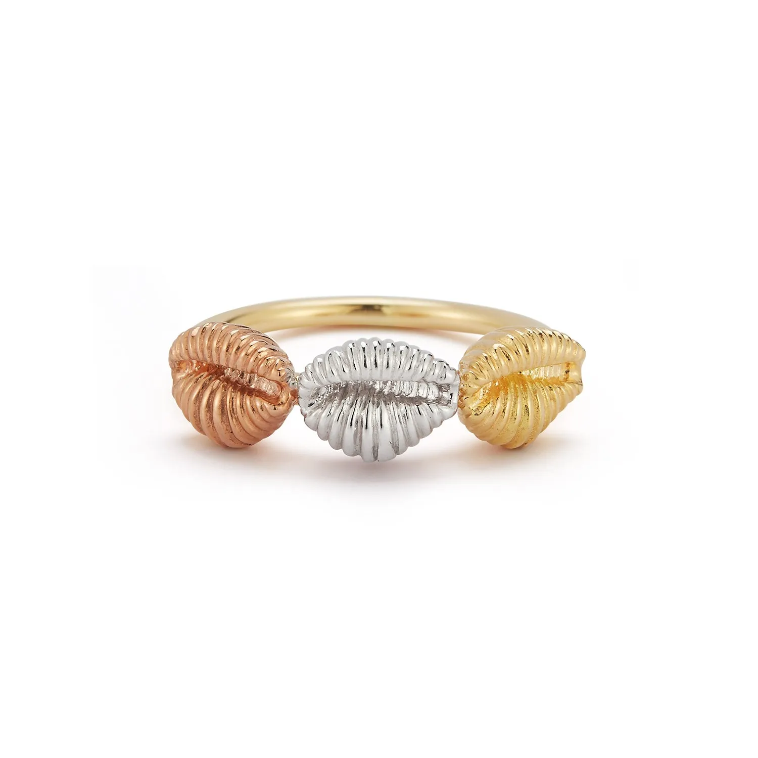 Three of our solid gold baby shells threaded as beads on a band of gold. This ring provides the illusion of an eternity band while still being comfortable on the finger. You'll be amazed at the detail and craftsmanship of this stackable ring.