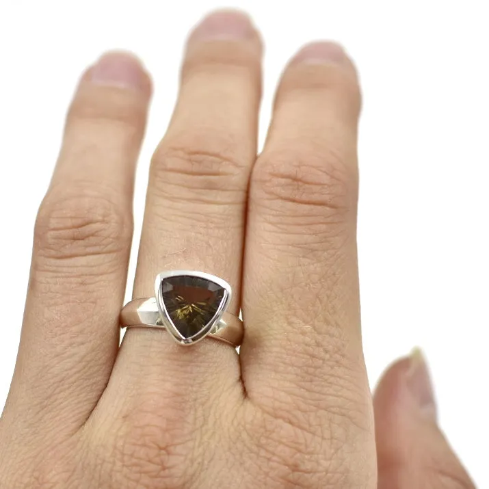 Set with 10mm lasercut triangle shaped smokey quartz or sky blue topaz gems, great sparkle,unique cut on 5mm wide triangle profile band