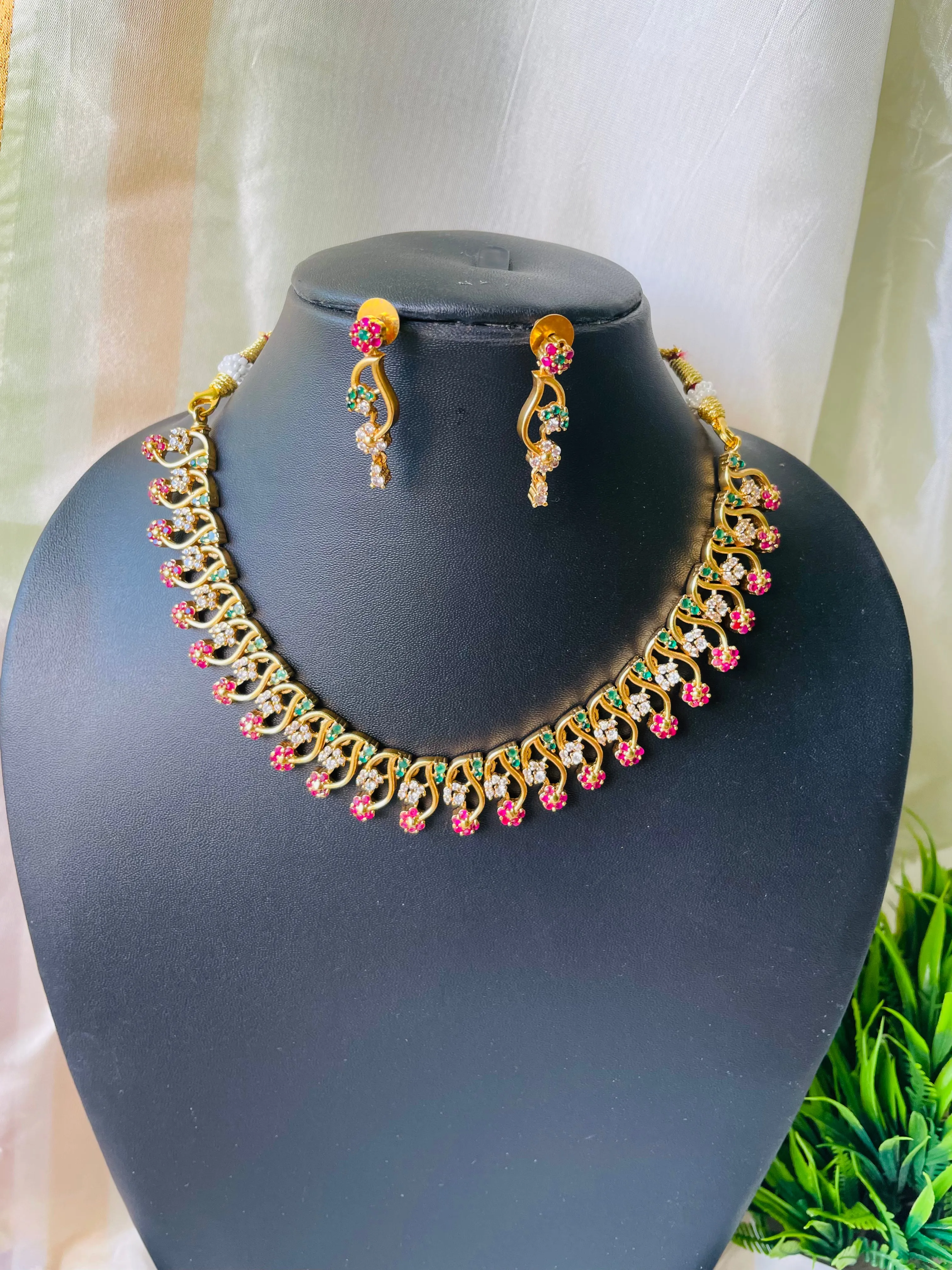 Embark on a journey through time with our exquisite collection of antique jewelry, Antique jewelry possesses a timeless allure, capturing the essence of bygone eras and reflecting the craftsmanship and design aesthetics of the past, Match Sringar's latest antique necklace with matching earrings to get the favorite spot in your accessory collection. The ruby premium AD stones used with the hanging beads give this necklace a magnificent look, and the matching hangingAD earrings ensure you stay comfortable and confident at your future events.