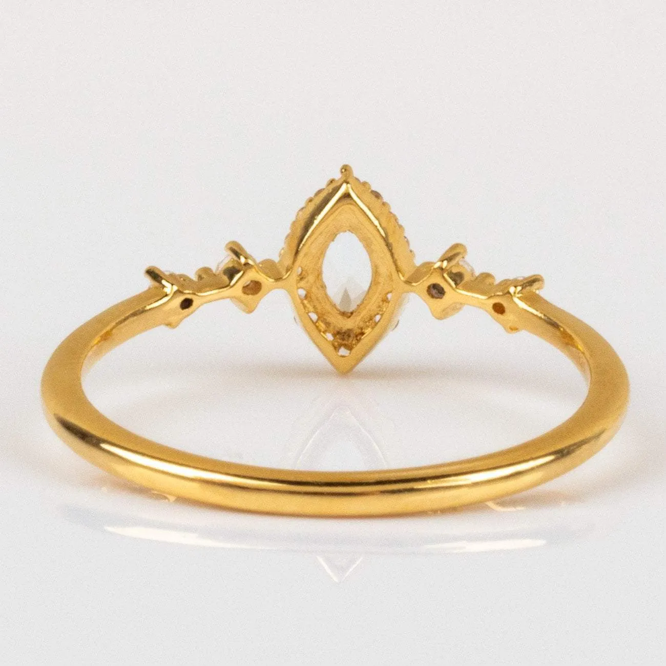 - Natural white topaz 4.8 x 2.3mm center stone, 2 & 1.3mm round stones
